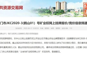 2020年8月17下午16:00,惠州交投葛埔綠色現代石場有限公司以底價9.62億元拍下龍門縣龍華鎮朗背村葛埔礦區采礦權。龍門縣龍華鎮朗背村葛埔礦區位于惠州市龍門縣龍華鎮朗背村,礦區面積1.1693千米,查明資源儲量為…