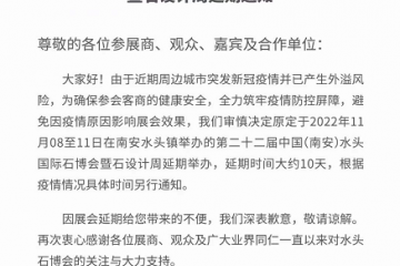 尊敬的展商、合作伙伴、設計師及各界友人: 大家好!因全國多個城市疫情爆發,泉州及周邊城市也已有病例,在此疫情防控關鍵時段,組委會及各相關單位召開了緊急磋商會議,決定將第22屆中國(南安)水頭國際石博會…