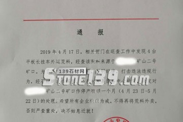 麻城市產(chǎn)業(yè)發(fā)展服務(wù)中心通報2019年4月17日,相關(guān)部門在巡查工作中發(fā)現(xiàn)4臺平板長掛車外運荒料,經(jīng)查該荒料來源于XXXX礦山二號礦口。為了嚴(yán)格礦山荒料管理,嚴(yán)明紀(jì)律,打擊違法違規(guī)行為,經(jīng)石材建設(shè)指揮部、市產(chǎn)業(yè)…