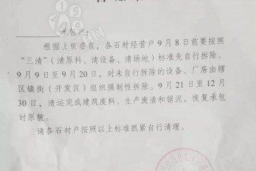 告知書__________________承包戶: 根據(jù)上級要求,各石材經(jīng)營戶9月8日前要按照“三清”(清原料、清設備、清場地)標準先自行拆除。9月9日至9月20日,對未自行拆除的設備、廠房由轄區(qū)鎮(zhèn)街(開發(fā)區(qū))組織強制性拆…