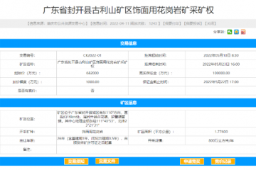 4月11日,肇慶市自然資源局發(fā)布公告,掛牌出讓一宗飾面用花崗巖礦采礦權(quán),擬出讓26年,含基建期1年,閉坑治理期0.5年,掛牌起始價(jià)68.2億元。該項(xiàng)目名稱為廣東省封開(kāi)縣古利山礦區(qū)飾面用花崗巖礦采礦權(quán),礦區(qū)位于廣…