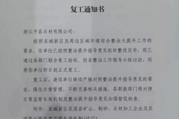 東城新區及周邊區域環境綜合整治大提升領導小組辦公室復第006號復工通知書浙江平昌石材有限公司:按照東城新區及周邊區域環境綜合整治大提升工作的要求,你單位已按照整治提升指導意見組織整改完畢,現已通過各部…