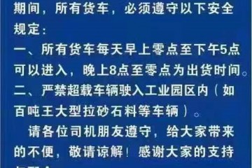 貨車通行公告各位司機朋友:由于工業園區道路維修處于養護期間,所有貨車,必須遵守以下安全規定:一、 所有貨車每天早上零點至下午5點可以進入,晚上8點至零點為出貨時間。二、嚴禁超載車輛駛入工業園區內(如百…