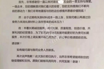 今日,麻城多家石材企業對外發布漲價通知,聲稱漲價是因為原材料一路上漲導致。▽調價通知致:尊敬的石材貿易老總及負責人:首先,非常感謝您一直以來對湖北xx石業的一貫支持與厚愛。一路走來,您的理解是對我們…
