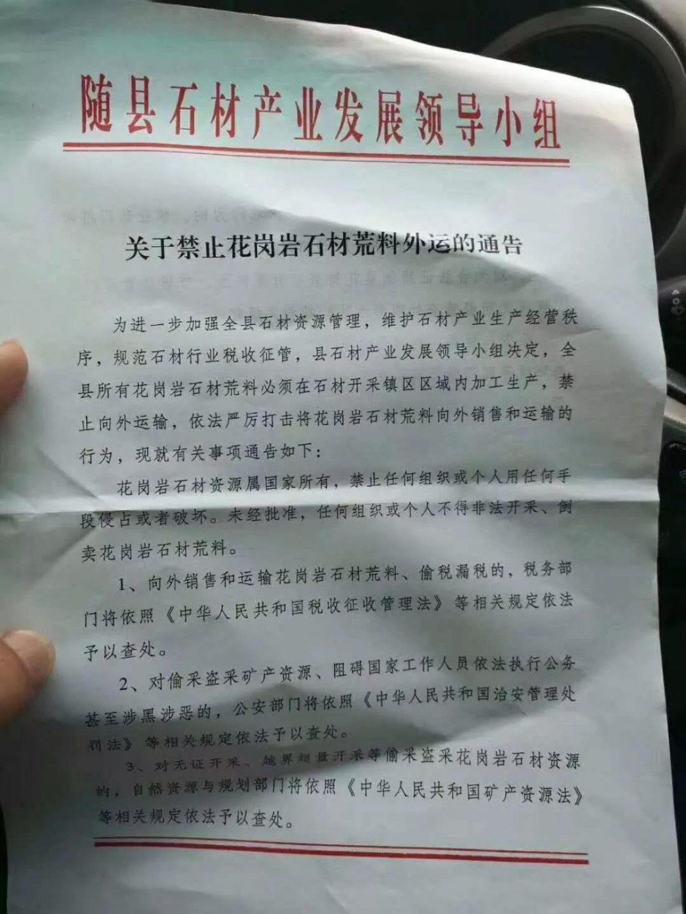 附件:隨縣石材產業發展領導小組關于禁止花崗巖石材荒料外運的通知