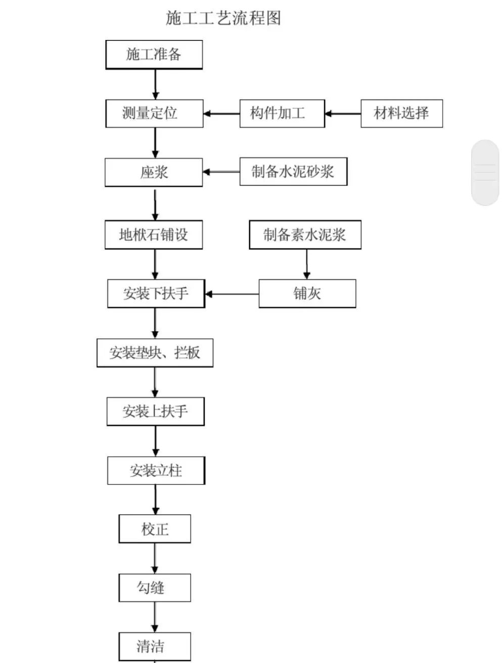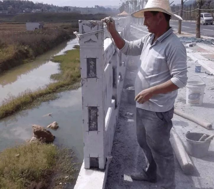 材料選擇→構件加工→安裝地袱石→安裝下扶手→安裝下墊塊→安裝攔板→安裝上墊塊→安裝上扶手→安裝立柱→勾縫→棱角打磨→清洗。