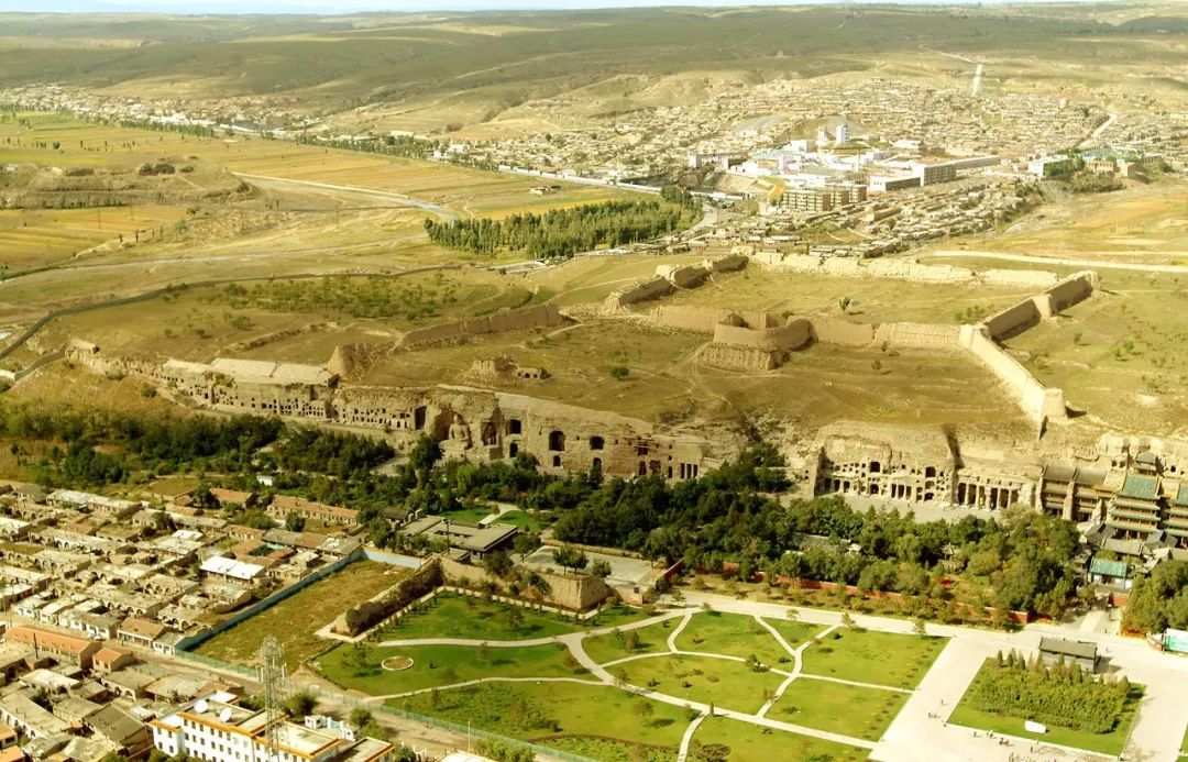 ▲ 云岡石窟全景圖,可以看到它開鑿在自然斷崖上。圖/圖蟲·創意