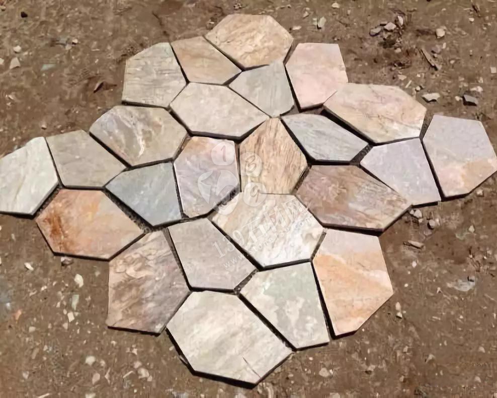 3、 碎塊大理石亦鋪在水泥砂漿找平層(結合層) 上, 可分倉或不分倉鋪砌, 亦可鑲嵌分格條, 為使邊角整齊, 應選用有直邊的一邊板材沿分倉或分格線鋪砌。