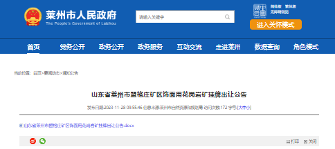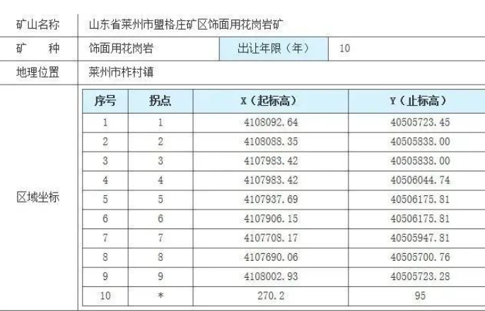 根據《中華人民共和國民法典》、《中華人民共和國礦產資源法》、《中華人民共和國電子簽名法》、《礦業權出讓交易規則》(自然資規〔2023〕1號)、《山東省礦業權網上交易規則》(魯自然資規〔2020〕6號)等有關規定,萊州市自然資源和規劃局擬對山東省萊州市盟格莊礦區飾面用花崗巖礦采礦權進行網上掛牌出讓。現將有關事項公告如下: