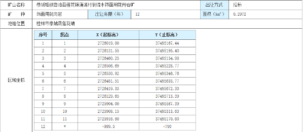 資源開發(fā)利用情況:本次出讓的恭城瑤族自治縣蓮花鎮(zhèn)蒲源村倒流水飾面用花崗巖礦屬于采礦權(quán)擴(kuò)大礦區(qū)范圍。開采規(guī)模:100萬立方米/年。采礦權(quán)儲量分為兩部分,一部分為原采礦權(quán)已出讓未開采的可采資源儲量。另一部分為原采礦權(quán)平面范圍外擴(kuò)大范圍的新增資源儲量,該部分儲量未進(jìn)行有償處置。兩部分整合為一個礦權(quán)進(jìn)行出讓。本次出讓為第二輪中央生態(tài)環(huán)境保護(hù)督察整改要求的整改礦山,涉及恭城縣蓮花蒲源倒流水花崗巖石場有限公司飾面花崗巖礦礦區(qū)范圍內(nèi)礦山資產(chǎn)及該礦山礦產(chǎn)品加工廠等資產(chǎn),經(jīng)評估資產(chǎn)共計人民幣23216.13萬元。