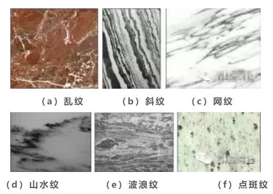 花紋:由裝飾石材的組分、結構、構造而呈現的圖像。花紋對石材非常重要,是衡量石材是否具有好的裝飾性能的重要指標。花紋有直紋、斜紋、亂紋、網紋、點紋、無紋、山水紋、波浪紋、斑紋之分。如圖3。直紋紋路近似于直線,并與石材長度邊或寬度邊近似平行。像“木化石”、“超白洞石”、“紅洞石”;斜紋紋路與板面的長或寬構成一定夾角。如“木紋黃”、“加洲金麻”;亂紋紋路雜亂無章,橫紋、直紋、斜紋交匯。如“雪花白”、“金黃天龍”、“金蜘蛛”、“紫羅紅”;網紋紋路如網狀,如“啡網紋”、“淺啡網”、“大花白”;山水紋紋路似山水風景畫。如“大花白”、“云灰”;波浪紋紋路似水波紋、海浪似的石材。如“海浪花”、“橄欖綠”;斑紋紋路石材表面有晶班狀的物質。如“藍珍珠”、“綠星”、“啡鉆”等;點紋紋路是石材表面有點狀的物質上。如“印度白金”、“雪中紅”、“印度黑金砂”。 石材表面花紋不均,這是有花紋的裝飾石材常見的通病。這種石材缺陷在于石材板面上有些地方紋路細,有些地方紋路粗。有些地方甚至根本無紋路,這也是一種特別容易引起糾紛的缺陷。代表性石材為“雪花白”、“大花白”、“加洲金麻”。