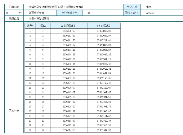資源儲量:本次出讓的岑溪市馬路鎮善村整合區(A區)飾面用花崗巖礦屬于整合礦山。采礦權儲量分為兩部分,一部分為原采礦權已出讓未開采的可采資源儲量。另一部分為原采礦權投影范圍內的原開采標高以外的新增資源儲量及原采礦權投影范圍外的新增資源儲量,該部分儲量未進行有償處置。兩部分整合為一個礦權進行出讓。保有飾面用花崗巖礦石量(控制+推斷)3640.5041萬立方米,荒料量944.25萬立方米。可利用飾面用花崗巖礦礦石量(控制+推斷)2769.17萬立方米,荒料量為756.3萬立方米。可利用的綜合利用建筑石料用花崗巖礦礦石量(控制+推斷)2012.8741萬立方米,折合5273.73萬噸。可利用的綜合利用全~強風化花崗巖(建筑用砂)礦石量為294.8579萬立方米,折合448.19萬噸,含砂量為179.73萬噸。可利用的綜合利用全~強風化礫巖(建筑用砂)礦石量為192.1057萬立方米,折合307.37萬噸,含砂量為112.16萬噸。可利用的綜合利用中風化花崗巖(填方用石料)礦石量402.5188萬立方米,折合1010.36萬噸。可利用的綜合利用礫巖(填方用石料)礦石量146.2189萬立方米,折合364.10萬噸。以上為本次出讓的資源儲量,礦價款收益已包含在本次掛牌起始價中。上述資源量已包含原采礦權已出讓未開采的可采資源儲量,其中飾面用花崗巖荒料46.35萬立方米,建筑用花崗巖807.52萬噸,建筑用砂31.19萬噸。整合區新增資源量估算范圍(含擴界和擴深范圍)內保有飾面用花崗巖礦石量(控制+推斷)2410.3376萬立方米(荒料量658.32萬立方米)。其中控制的資源量1542.8267萬立方米(荒料量421.35萬立方米);推斷的資源量822.5613萬立方米(荒料量224.67萬立方米)。