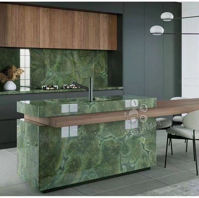它的板面是深邃迷人的墨綠,白色的晶體融入其中,就好似吉祥如意的仙鶴,不僅質地溫潤,更宛如大自然鬼斧神工的藝術品。而那熠熠生輝的綠色光澤,又好像將你帶入了生機勃勃的綠色世界。無論是家居裝飾還是藝術收藏,一塊如此特別的大理石都能讓你的品味與個性得到充分的展現。