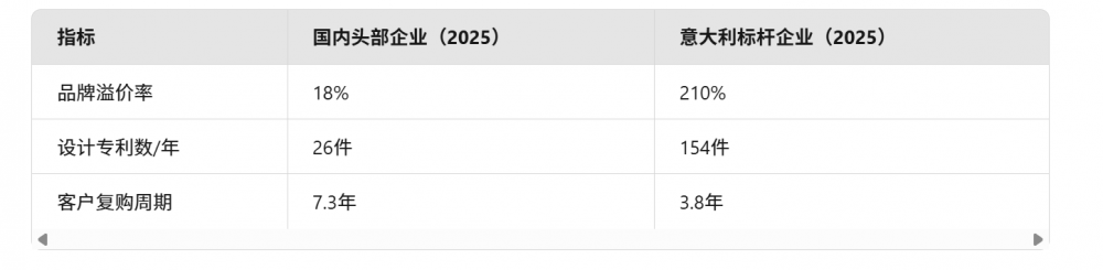 指標(biāo) 國(guó)內(nèi)頭部企業(yè)(2025) 意大利標(biāo)桿企業(yè)(2025)