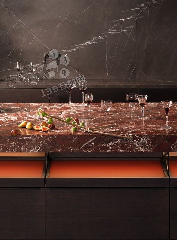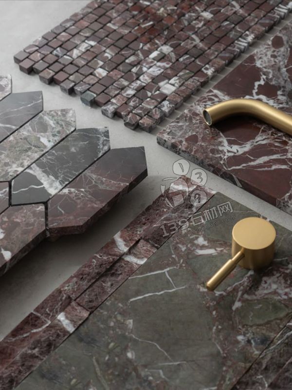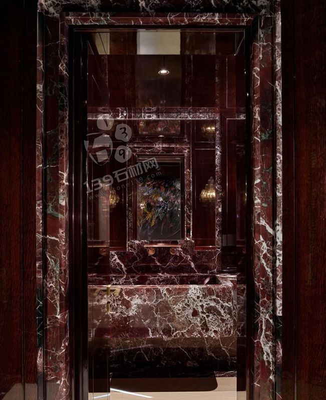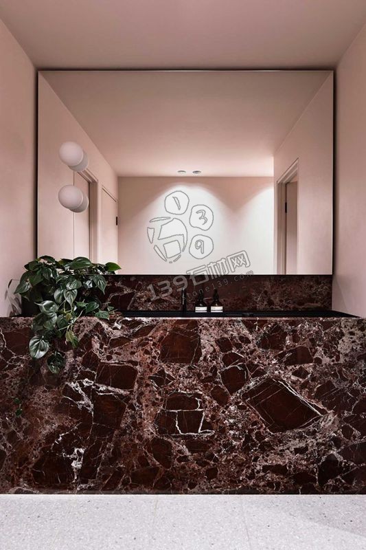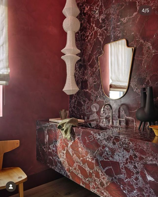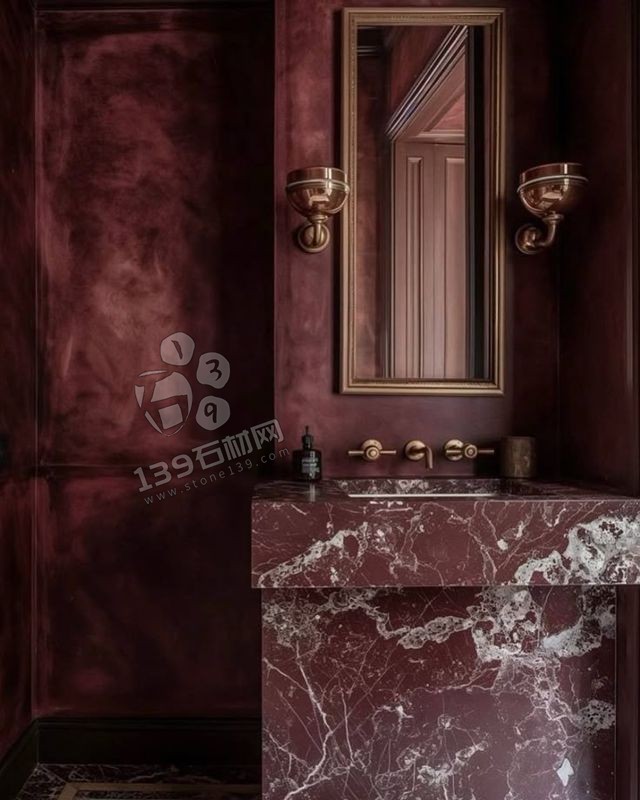 在潮濕環境中,紫羅紅大理石的耐候性需優先考量(建議選人工染色板或優質天然石)。可將其用于浴室臺面或局部墻面,搭配啞光黑金屬支架或深色瓷磚,形成高級感對比。例如,懸浮式臺盆搭配紫羅紅大理石臺面,背景墻以幾何拼花點綴,瞬間打破傳統衛浴的沉悶。