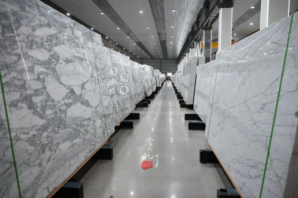 庫存“巨無霸”:在水頭石材博覽中心,捷成的倉儲基地占地超2萬平方米,大花白庫存常年保持在5萬㎡以上,涵蓋常規板(600×600mm、800×800mm)、工程板(1200×2400mm、1500×3000mm)、異形板(弧形、拼花)等全規格,甚至連“斷貨王”級別的意大利雪花白、云石白等稀缺品種都能快速調貨——行業內流傳一句話:“找大花白,先去捷成看有沒有貨。”