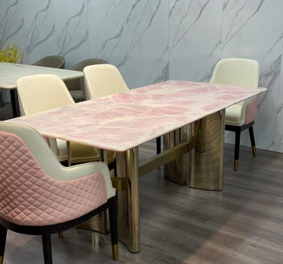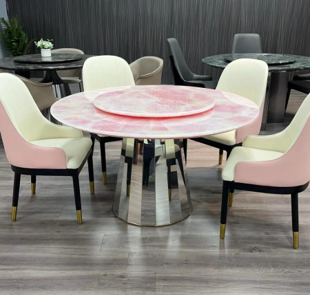 粉水晶奢石餐桌是空間的 “顏值擔當”,無論是方形還是圓形設計,都能輕松打造輕奢氛圍感: