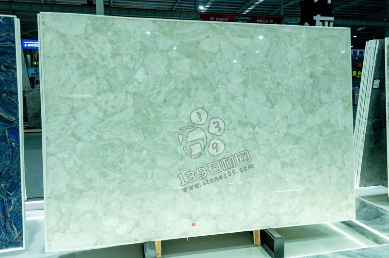 這張白水晶石材的紋路呈現出不規則的塊狀晶體交織形態,紋理如同破碎的冰晶或水晶碎片自然拼接,大小不一的 “晶體塊” 相互融合,沒有明顯的方向性,屬于無序卻富有層次的紋理結構。
