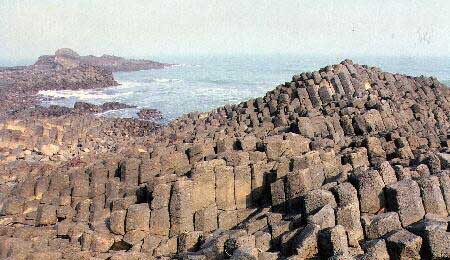中侵入巖是地下巖漿在內力作用下侵入地殼上部,巖層冷卻凝固而形成巖石,它的礦物結晶顆粒較大,代表巖石有花崗巖。噴出巖是地下巖漿在內力作用下,沿地殼薄弱地帶噴出地表冷凝而形成巖石,它的礦物結晶顆粒細小,有的有流紋或氣孔構造,代表巖石就是玄武巖。