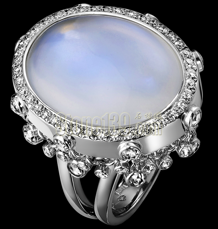 2、月長石:(礦物學名叫“微斜長石”)因為具有“月光效應”(石中心出現恍若月光的幽藍或亮白的暈彩)而被叫做月光石。由兩種長石混合組成。其中,冰長石和鈉長石混合組成最常見。質量好的月光石呈半透明狀,有似波浪漂游的藍光。較差的呈半渾濁狀。更低檔的只有暈彩沒有藍光。因可招來美好如月光般的浪漫愛情,又稱“情人之石”