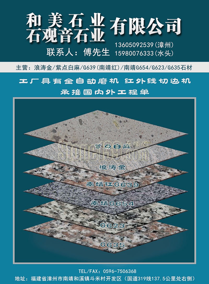 和美石材(石觀音石業(yè))位于福建南靖縣和溪鎮(zhèn)斗米村開發(fā)區(qū),主營產(chǎn)品有南靖紅、G639、連城紅、G623、喬治亞灰、灰麻、南靖G654、承接國內(nèi)外石材工程單。歡迎新老客戶的光顧!