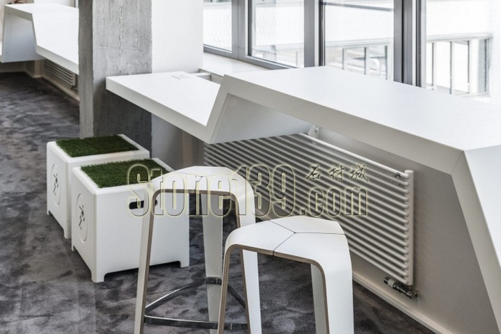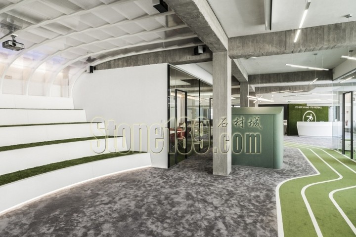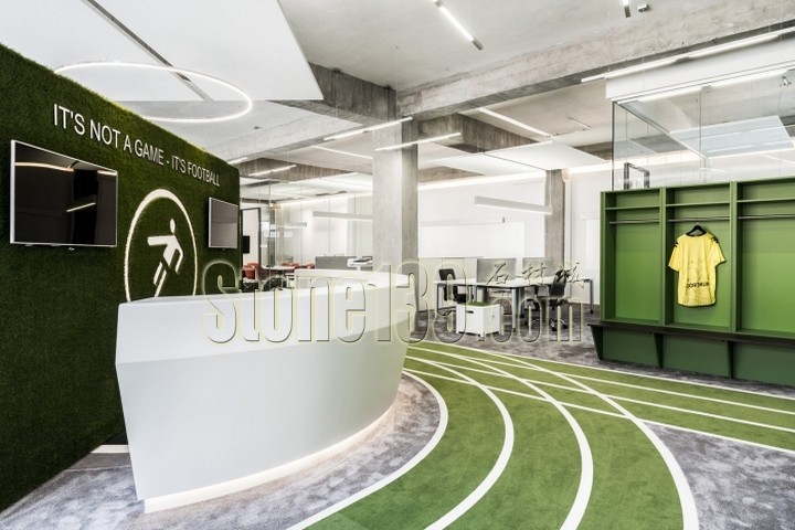 TKEZ Architects 建筑事務所最近完成了一個柏林廢棄工廠的改造設計,使之完全煥然一新,看上去像是足球主題公園一般,而事實上,這正是 onefootball 公司的全新辦公室。辦公室內的地面引導標識被涂刷成一條醒目的綠茵跑道,而與足球相關的箭頭、圖案乃至一個模擬球場也被放到了墻面作為裝飾,整個空間則保留了原有的工業氛圍,并以足夠的挑高和落地窗帶來敞亮感。