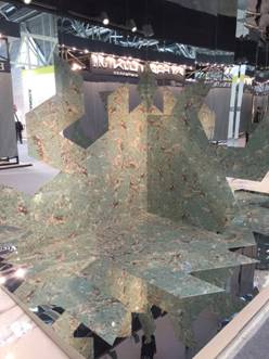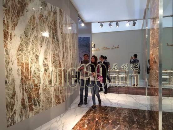 展位設計啟用的意大利團隊,由法國羅浮宮博物館修繕設計大師盧卡•羅西(Gianluca Rossi)率領,這位被譽為“空間藝術的先鋒騎士”采用大理石的表現(xiàn)手法呈現(xiàn)簡一大理石瓷磚的逼真效果。
