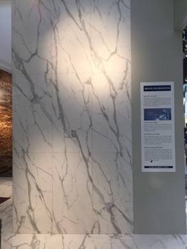 在展位布置上,不僅將技術工藝再度升級的新一代大理石瓷磚與相對應的天然石材做比對陳列,地面也全部采用不同效果的新品雪花白2,直觀展現(xiàn)了新品一石N面、表面紋理自由拼接可達到基本連體的特征。