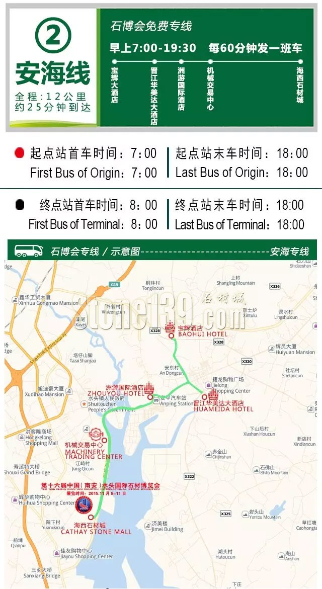 安海線首發(fā)地點為寶輝大酒店,途經(jīng)晉江華美達大酒店、洲游國際酒店、機械交易中心,終點為海西石材城。起點站首車時間為7:00,起點站末車時間為18:00;終點站首車時間為8:00,終點站末車時間為18:00;每60分鐘發(fā)一班車。