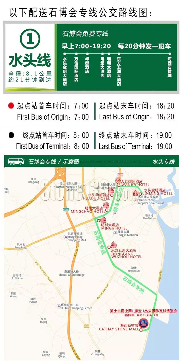 水頭線首發(fā)地點為水頭金明大酒店,途經(jīng)萬佳國際酒店、華都酒店、明超大酒店、明利大酒店、東方五洲大酒店,終點為海西石材城。起點站首車時間為7:00,起點站末車時間為18:20;終點站首車時間為8:00,終點站末車時間為19:00;每20分鐘發(fā)一班車。