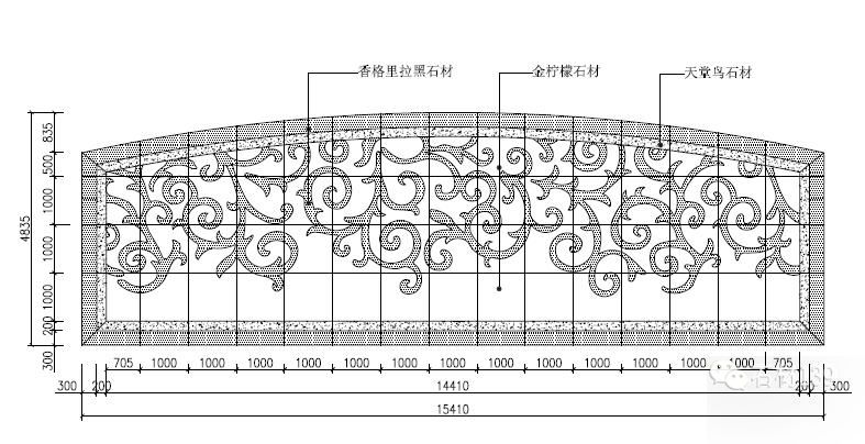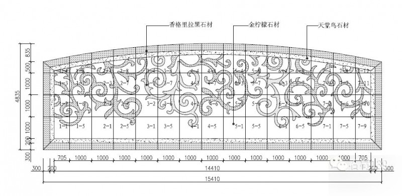 該酒店的石材拼花約占3,050㎡,這些石材拼花主要使用在酒店的大堂、電梯廳、衛生間及公共走廊等空間的地面。在這些石材拼花中,拼花的種類及不同規格就有30多種,我們選取1F大堂服務總臺處地面的一種石材拼花為例具體進行解析: