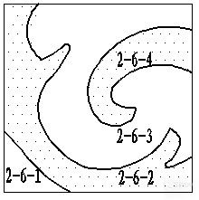(1)、水刀設備切割機將完成好的1000×1000的香格里拉黑石材切割成2-6-2、2-6-4的形狀,同樣的操作將完成好的1000×1000的金檸檬石材切割成2-6-1、2-6-3的形狀,此時工廠得到2-7部分石材的4個組合板塊。