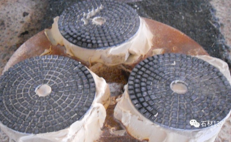 7、磨邊、打磨拋光:2-6-1、2-6-2、2-6-3、2-6-4四塊石材的拼花,由于是人工拼成,所以板與板之間水平、垂直方向會出現錯位,這時就需要待石材膠干透(24小時內)后,對1000×1000拼花板的四周進行磨邊,對板面需要打打磨。粗磨:采用0#磨頭對拼花石進行打磨,打磨完后刮掉石材面上的水,檢查石材的平整度、板面上是否有孔洞,若有孔洞需進行修補,待平整度滿足要求以及修補完孔洞進行下一道工序細磨。細磨:對粗磨后的石材進行細磨,利用磨頭將石材產品的花紋、顆粒、顏色都能夠清楚地顯現出來,使表面細膩、光滑,并富有微弱的光澤。細磨完成后再進行打蠟拋光。