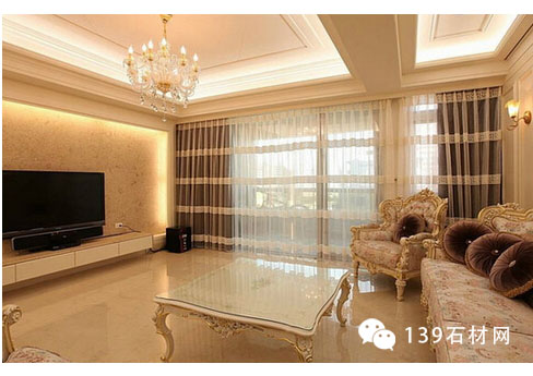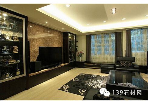 紋理豐澤的巴洛克大理石,從壁面延伸到電視柜平面,一體成形的設計,在周圍間接光源的襯飾下,更見大戶人家風范。