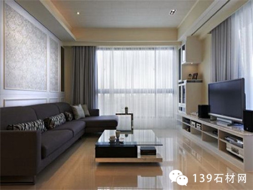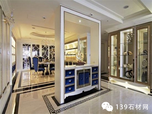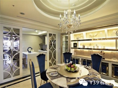 鏡面材質的應用,在客廳電視主墻面上導以菱形收邊,框定住了石材電視主墻層次放大、推演,豐富視覺效果。