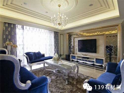 客廳:對應著金色奢美,沙發背墻對稱成景,表現了新古典基調。