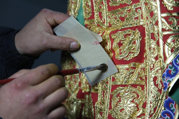 貼金工藝是彩繪裝鑾中最后一道工序,在這道工序中,金膠的稀釋比例以及干濕程度對金箔的平順效果會產生一定影響。