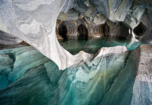 這些大理石巖洞座落于智利南端的偏遠地區。為了到這里觀光,游客必須從首都圣地亞哥搭乘飛機,前往最近的大城市科哈依克,相距800英里(約合1287公里),而后乘車穿過泥濘的道路,來到卡雷拉將軍湖南部200英里(約合321公里)處。