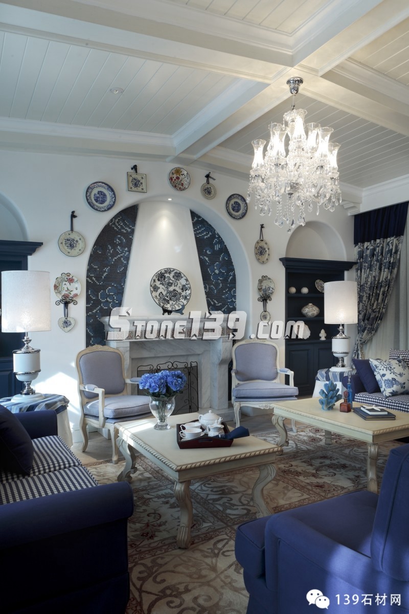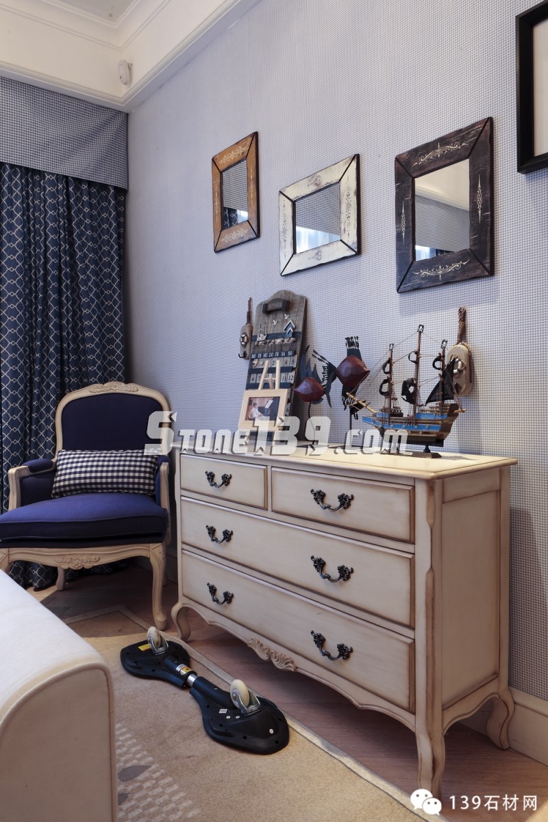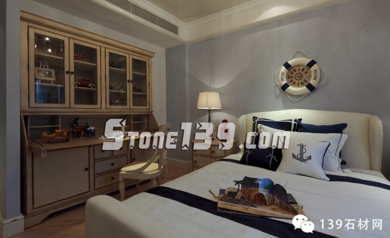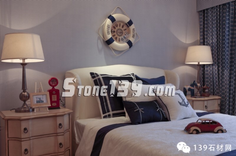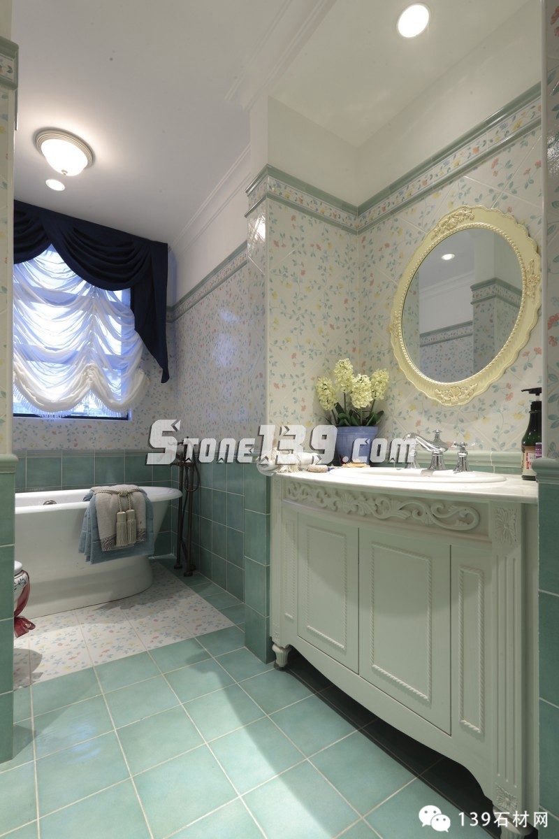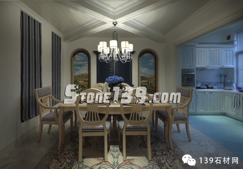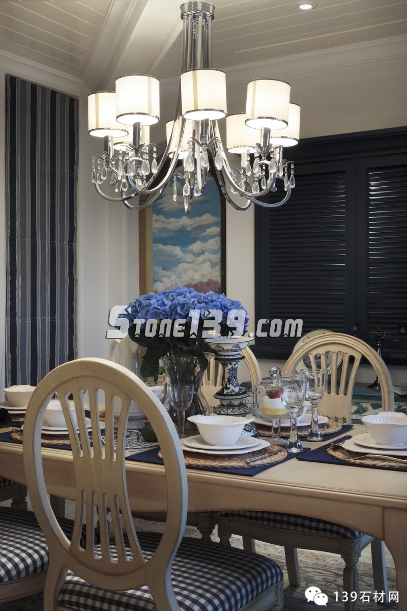 明快的藍、純凈的白讓人產生溫暖的情感,隨意精致的燈飾讓空間增添光影之余,更映襯出整個空間洋溢著愜意、輕快之調??茨菧睾偷木G草地磚,在廚房、化妝間和浴室之間顯得如此清爽,配上清雅的墻面瓷磚和掛畫擺設,現代飲食男女更是喜歡在這種明快、浪漫、溫馨的氛圍中,在刀、叉、杯、碟輕碰中歡聲細語,釋放兩者之間的“尺度關系”。