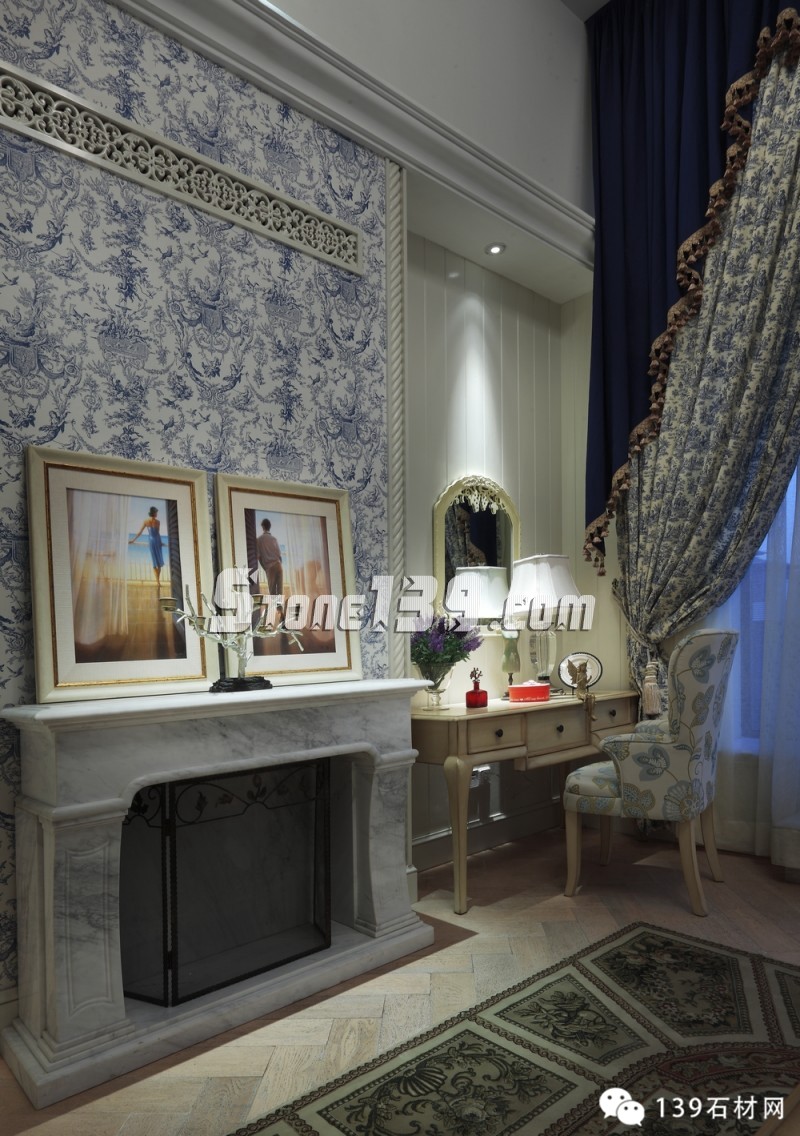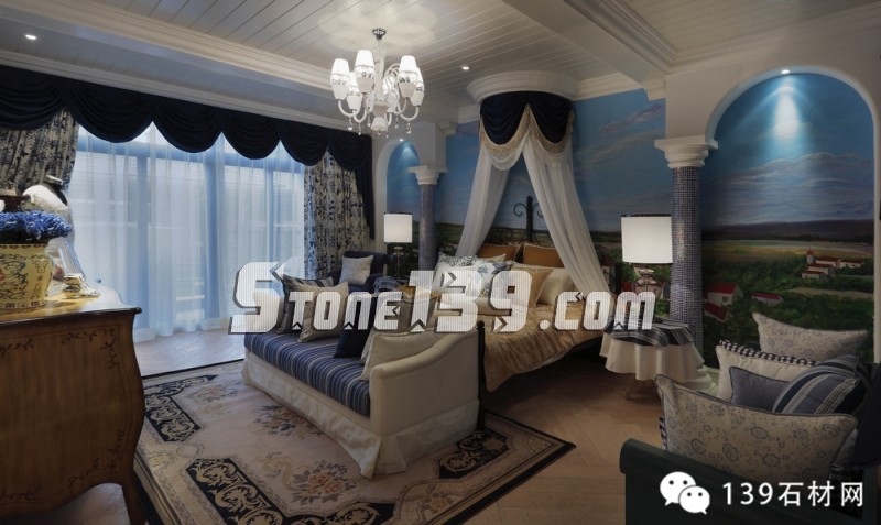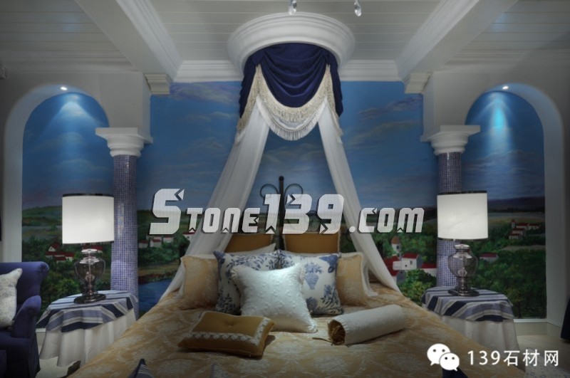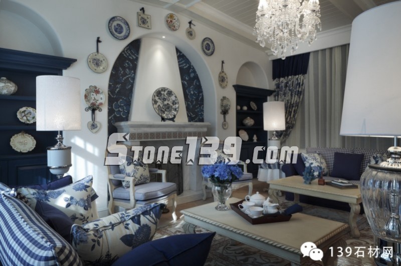 藍白條紋、古典碎花、花朵馬賽克以及各種藍與白的花樣圖案以不同的搭配方式重現在這四層空間的各個角落,仿如瞬間墜入天與海的懷抱。加上時時出現的格拉斯風景壁畫,那藍天、白云、綠野和小屋,將人帶入十七世紀的格拉斯。