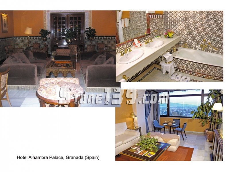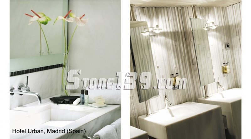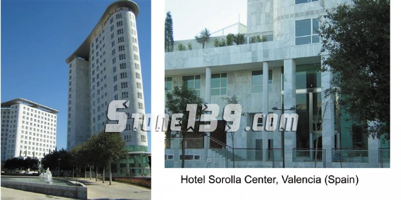 大理石的洗手間,鍍金的水龍頭,各種臺(tái)階,圓柱,地面使用的都是這種天然大理石,以此來領(lǐng)先酒店裝修的新潮設(shè)計(jì),那些在裝 飾方面尋找與眾不同,時(shí)髦和新穎的酒店,都很喜歡這種天然石材。另外,還可用于外墻的裝飾,這樣使酒店看起來與眾不同,最有代表性的酒店是Valecia (瓦倫西亞)市的Hotel Sorolla Center (索若亞中心酒店)。
