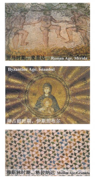 在西班牙,這一時期的鑲嵌工藝品幾乎沒有遺存。僅在某個修道院或教堂中有些殘留物,但其技術仍保存至今。因為鑲嵌大師采用了這一技術。意大利拉貝納的鑲嵌工藝品,或尚保存在土爾其和希臘的鑲嵌工藝品都是舉世無雙的。穆斯林人于8世紀到達西班牙導致拜占庭鑲嵌工藝沒有像羅馬鑲嵌工藝那樣扎下根來。