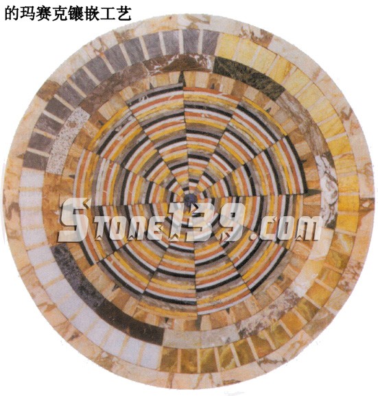 不管使用何種技術,鑲嵌工藝的特點是嵌面均用黏合劑固定,形成一個整體,嵌面石是切割的硬石,組成花紋圖案。