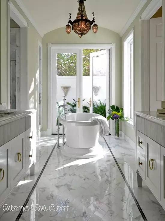 如果朋友們更喜歡大理石地板的話,門廳作為一個正式的迎客地方,鋪設(shè)大理石地板是最好不過的了。甚至可以試試就鋪出一條充滿設(shè)計感的大理石“小路”,從客廳延伸到餐廳。大理石也是增加主人套房浴室貴氣的關(guān)鍵,浴室里面用上它,這個可不用吝惜。