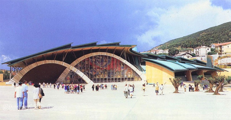 3、建筑師倫佐 皮亞諾和工程師彼得?懷斯合作設(shè)計的意大利教士朝圣教堂(Padre Pio Pilgrim-age),利用了當(dāng)?shù)氐氖牟⒉捎昧撕髲埑兄剡@一石材運(yùn)用的新技術(shù),形成了45m跨度的石拱結(jié)構(gòu),創(chuàng)造了石材跨度的歷史之最.而整個建造過程也是石材開采、工廠加工、施工過程一系列的高新技術(shù)的運(yùn)用成果,將石材的性能發(fā)揮到了極致。