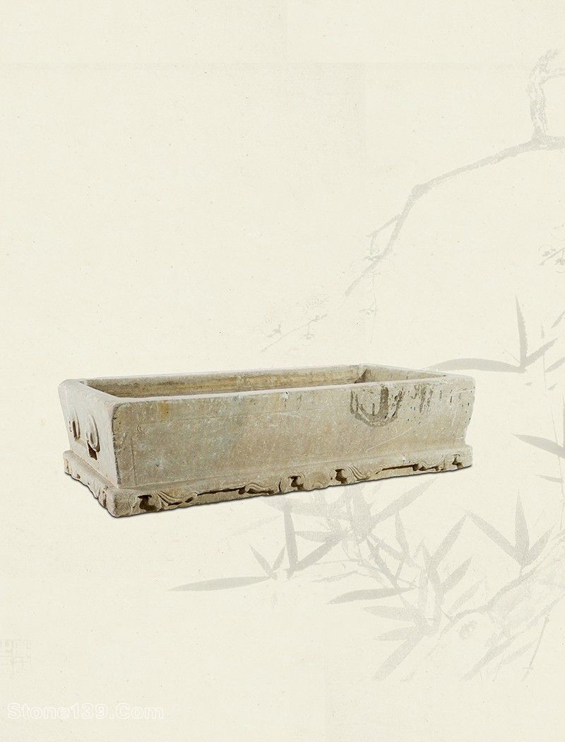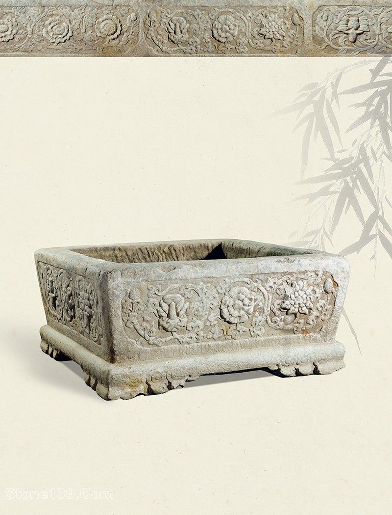 說(shuō)明:石盆藝術(shù)代表著一種藝術(shù)追求和精神文化上的享受,是庭院文化的最直接的載體,是一種品味和內(nèi)涵的象征。拍品四面淺刻纏枝寶相花紋飾,四面各不相同,支脈環(huán)繞,形態(tài)極為繁茂華麗,且雕工精細(xì)生動(dòng)。寶相花寓意吉祥,體現(xiàn)了物主對(duì)于生活的期盼和藝術(shù)上的追求,是一件不可多得的庭院藝術(shù)珍品。