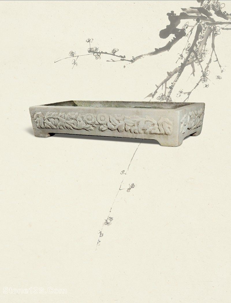 說(shuō)明:拍品石盆選取上乘漢白玉材質(zhì),長(zhǎng)一百二十二公分,器型碩大,石質(zhì)細(xì)膩潤(rùn)白。正面及左右兩側(cè)以剔地突起的方式雕刻花卉紋,花卉枝葉飽滿連綿,富有生命力,頗為精致。整體雕工精細(xì)到位,刀風(fēng)大氣流暢,設(shè)計(jì)感極強(qiáng),精巧雅致,是一件雕工考究文化氣息濃郁的石盆精品。