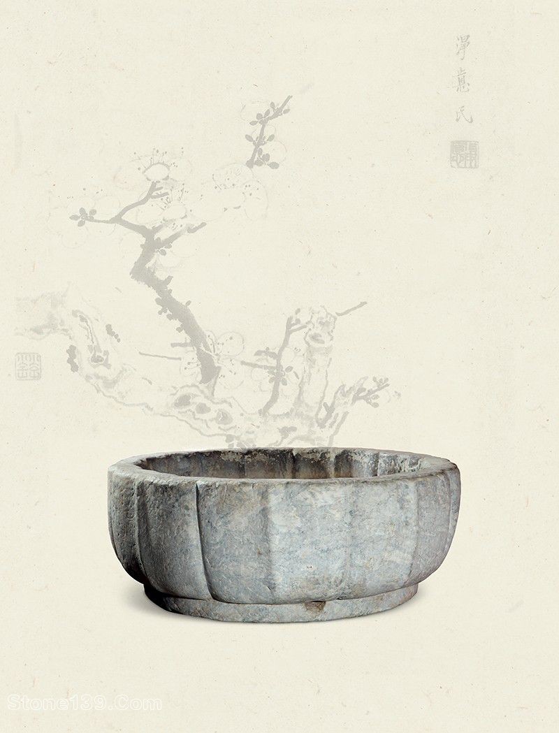 說(shuō)明:此拍品漢白玉葵口盆,直徑八十九公分,盆壁厚實(shí),印刻稜線,器形飽滿,盆足圓形。石盆制作規(guī)整,葵口式的器形沈靜優(yōu)雅,體現(xiàn)中國(guó)古典器物之美,是一件不可多得的庭園藝術(shù)精品。