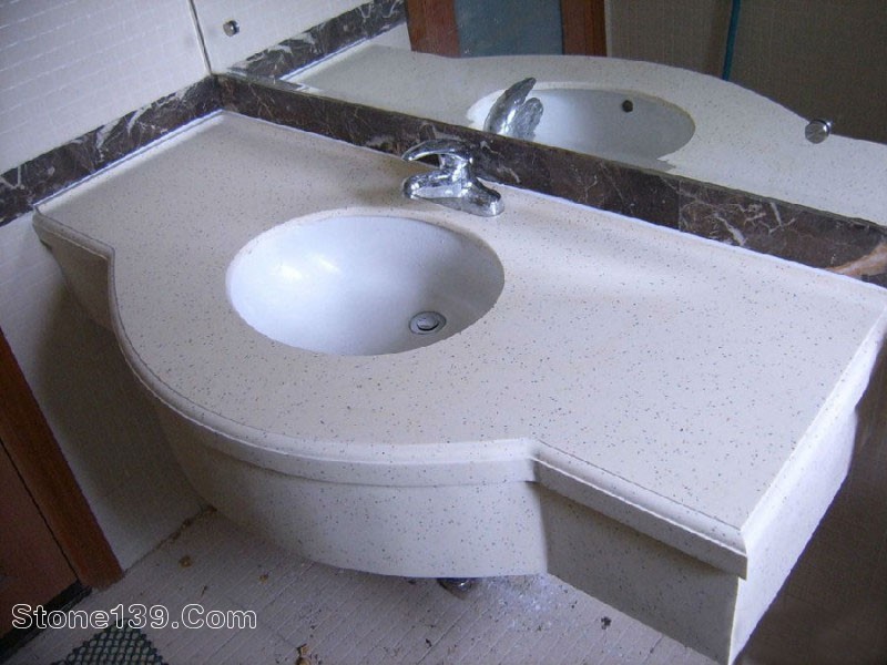 人造石臺面克服了大理石所有的缺點,花樣品種多,價格也很適合,防水能力超強,無裂紋當然也不會斷裂,加工造型多樣化。缺點:由于含大量壓顆粒材料(塑料成分),所以硬度稍微差點(容易劃傷),長期高溫容易導致變形。