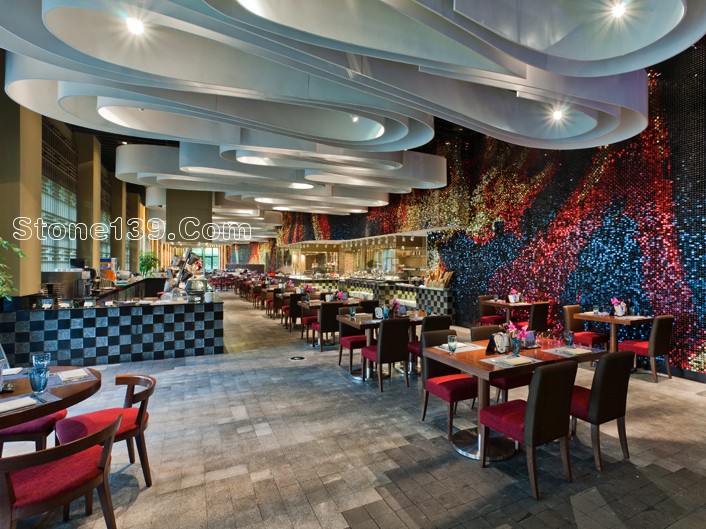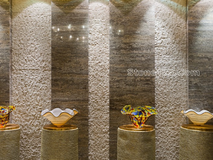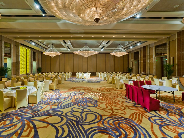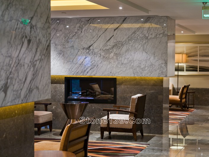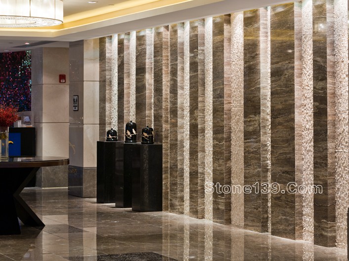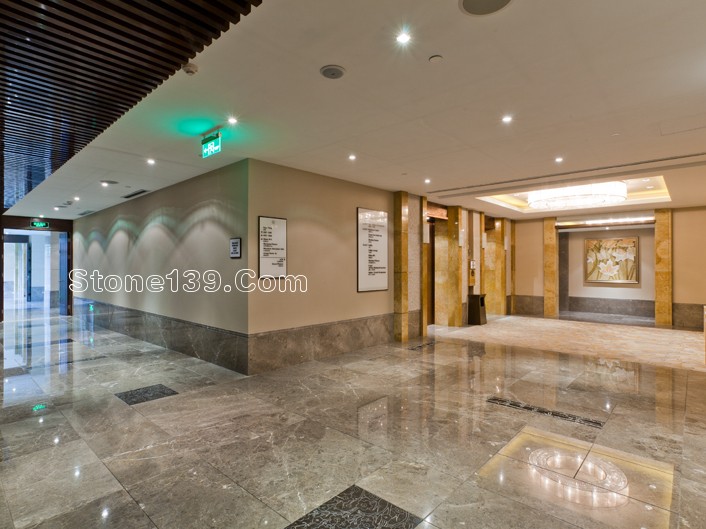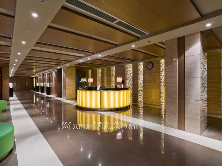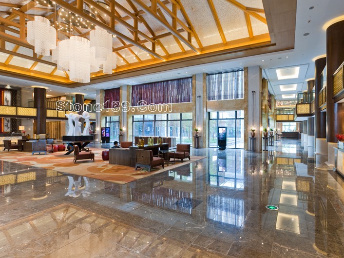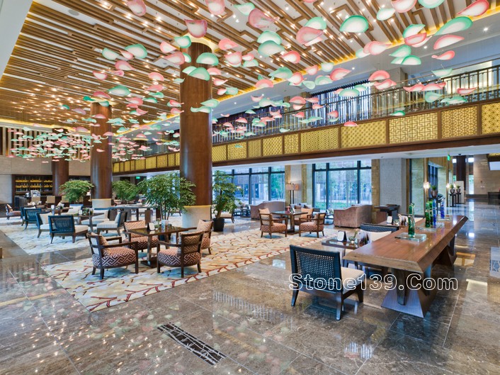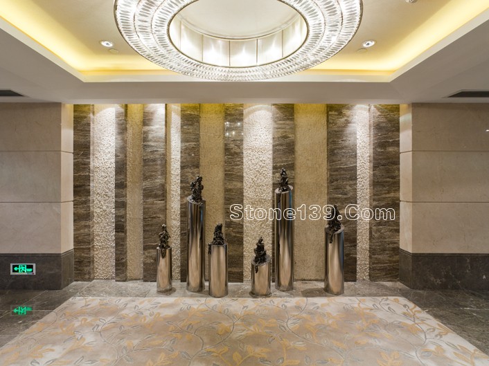 不過今天主要討論的是該酒店的石材裝飾部分。該石材工程主材為伊利諾灰、意大利木紋,主要加工部位為大堂、宴會廳及走廊燈,含雕刻、拼花、線條燈多種產品類型。下面就一同來欣賞吧。